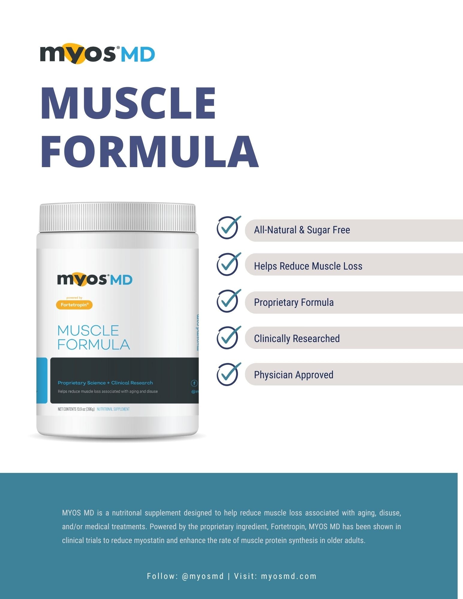Fortetropin® is derived from fertile chicken egg yolk and has been clinically shown to lower myostatin, a protein that inhibits muscle growth. Whether you're focused on weight loss, post-surgery recovery, or just staying active, MYOS MD helps you age powerfully and keep muscles strong for life's important moments.